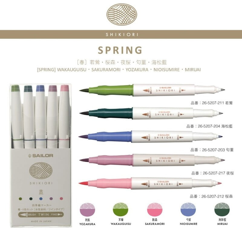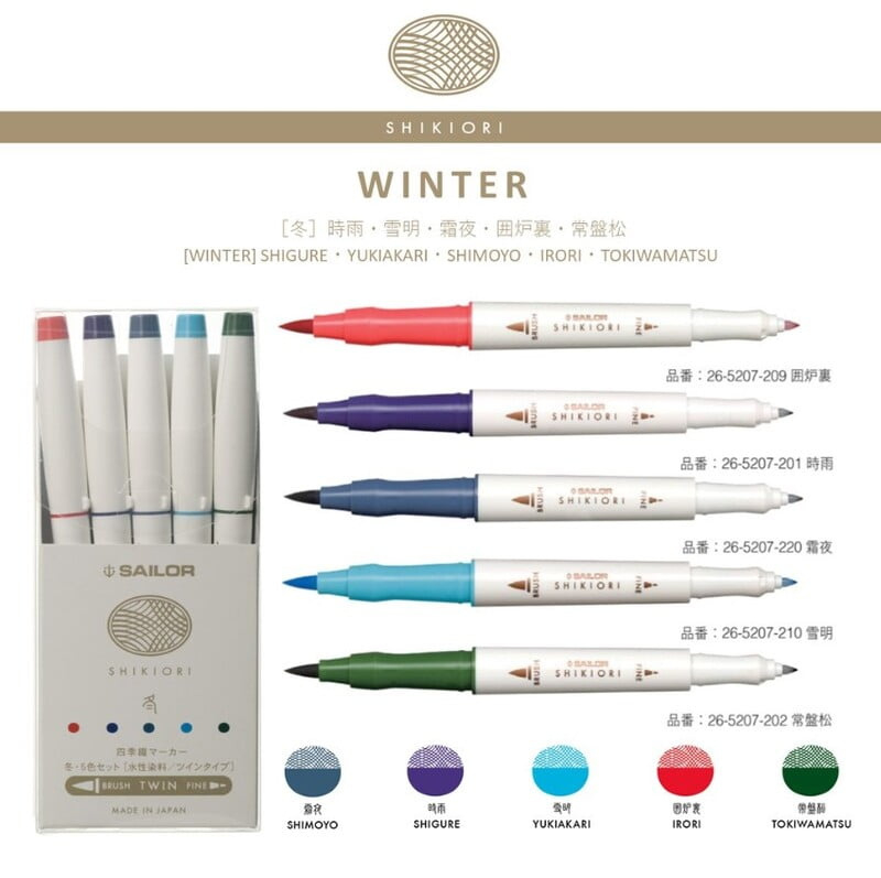 ∙ Sailor has created brush pens that mimic the colours of their fountain pen inks ∙ Double-sided, with a brush pen at one end and a fine nib at the other. ∙ The brushes are softer than most marker pens & resemble with real…